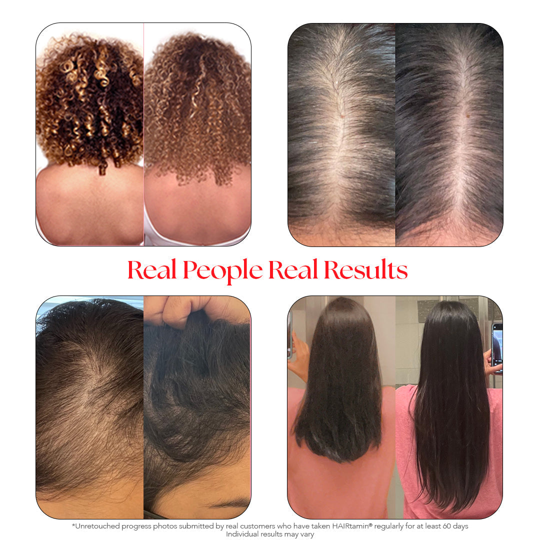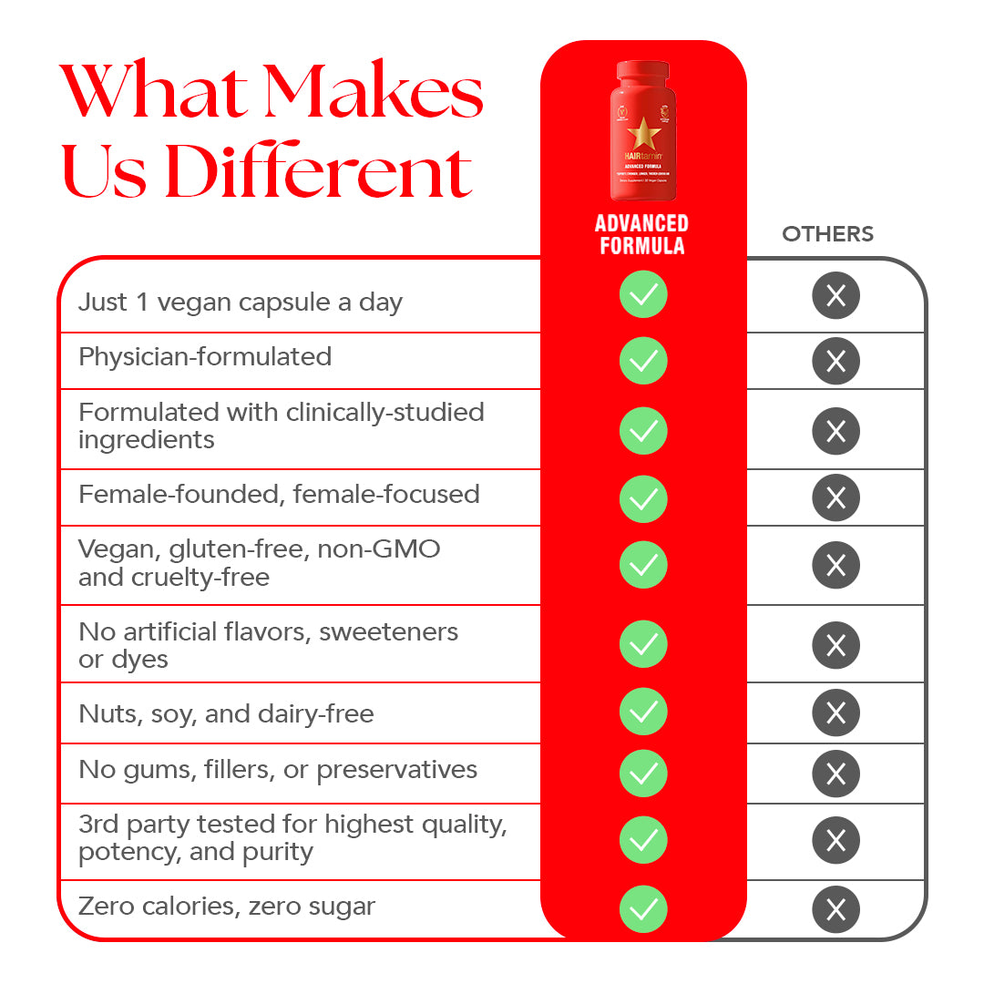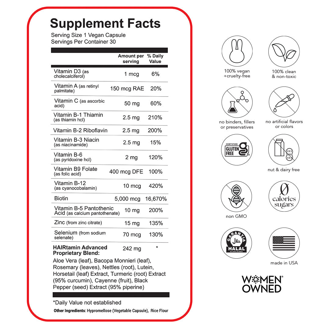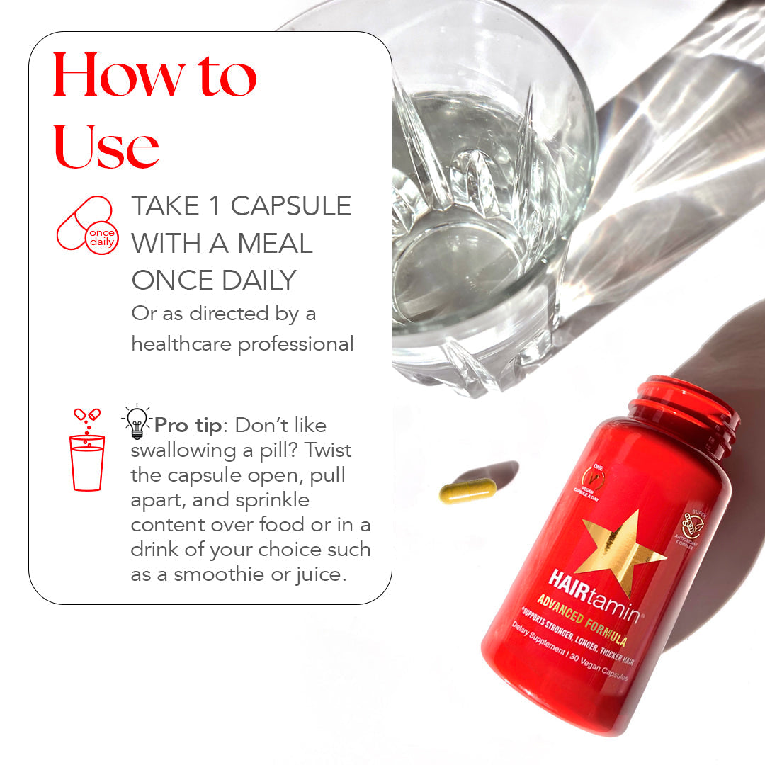 HAIRtamin® Advanced Formula is a physician-formulated, clean, one-a-day, hair nourishing supplement with clinically-studied, vegan ingredients that can help maintain stronger, longer, thicker-looking hair. Our proprietary blend of essential hair-loving vitamins, minerals and herbs, plus a potent super antioxidant complex, synergistically work together to help maintain healthy hair growth, retention and follicle strength from the inside out.